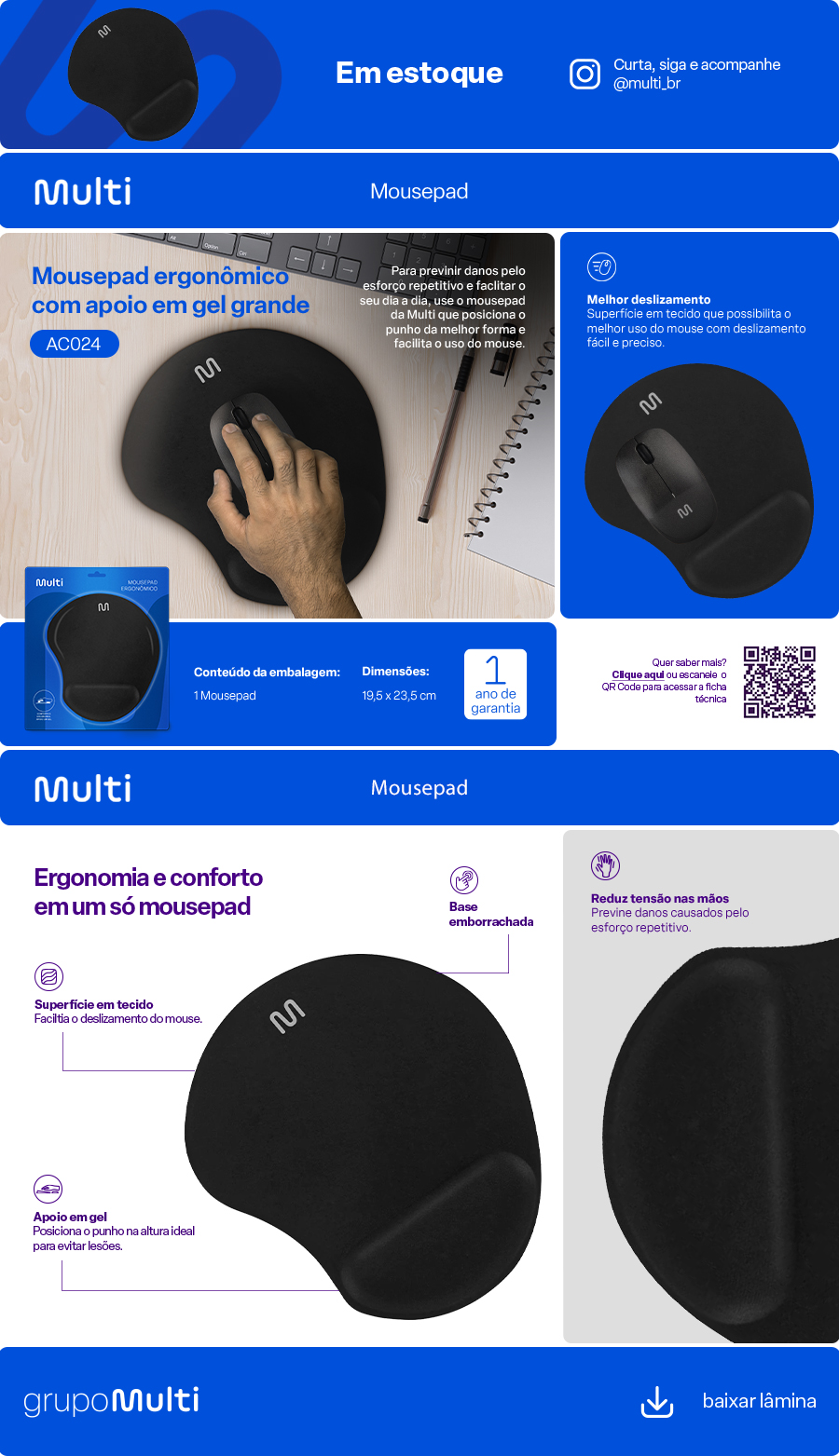 Mouse Pad Multilaser Gel, desenvolvido para reduzir a tensão das mãos e para prevenir danos causados pelo esforço repetitivo. Feito para posicionar o punho na altura ideal para evitar lesões durante a utilização do mouse. Detalhes: - Confortável. - Excelente acabamento. - Tamanho(AxLxC): 24.5cm x 2.5cm x 28cm - Previne danos causados pelo esforço repetitivo. - Posiciona o punho na altura ideal para evitar leses. - Superfície em tecido que facilita o deslizamento do mouse. - Apoio ergonômico em gel super macio para animizar a fadiga. - 1 ano de garantia pelo fabricante