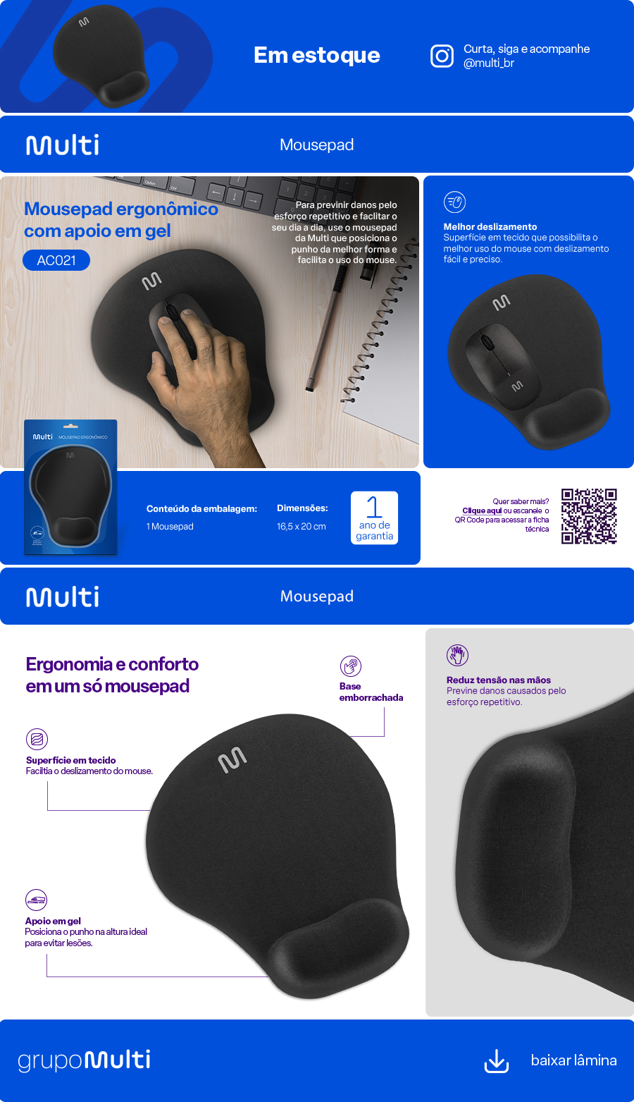 O Mouse Pad Multi Com Apoio Gel, foi desenvolvido para reduzir a tensão das mãos, para prevenir danos causados pelo esforço repetitivo, ele é feito para posicionar o punho na altura ideal para evitar lesões durante a utilização do mouse. Seu apoio ergonômico em gel super macio serve para amenizar a fadiga, tudo isso para te proporcionar conforto e qualidade de vida para você. Feito com superfície em tecido que facilita o deslizamento do mouse, conta também com um excelente acabamento para te oferecer qualidade também. Detalhes: - Confortável. - Excelente acabamento. - Tamanho(AxLxC): 18.5cm x 2.5cm x 27cm - Previne danos causados pelo esforço repetitivo. - Posiciona o punho na altura ideal para evitar leses. - Superfície em tecido que facilita o deslizamento do mouse. - Apoio ergonômico em gel super macio para animizar a fadiga. - 3 anos de garantia pelo fabricante