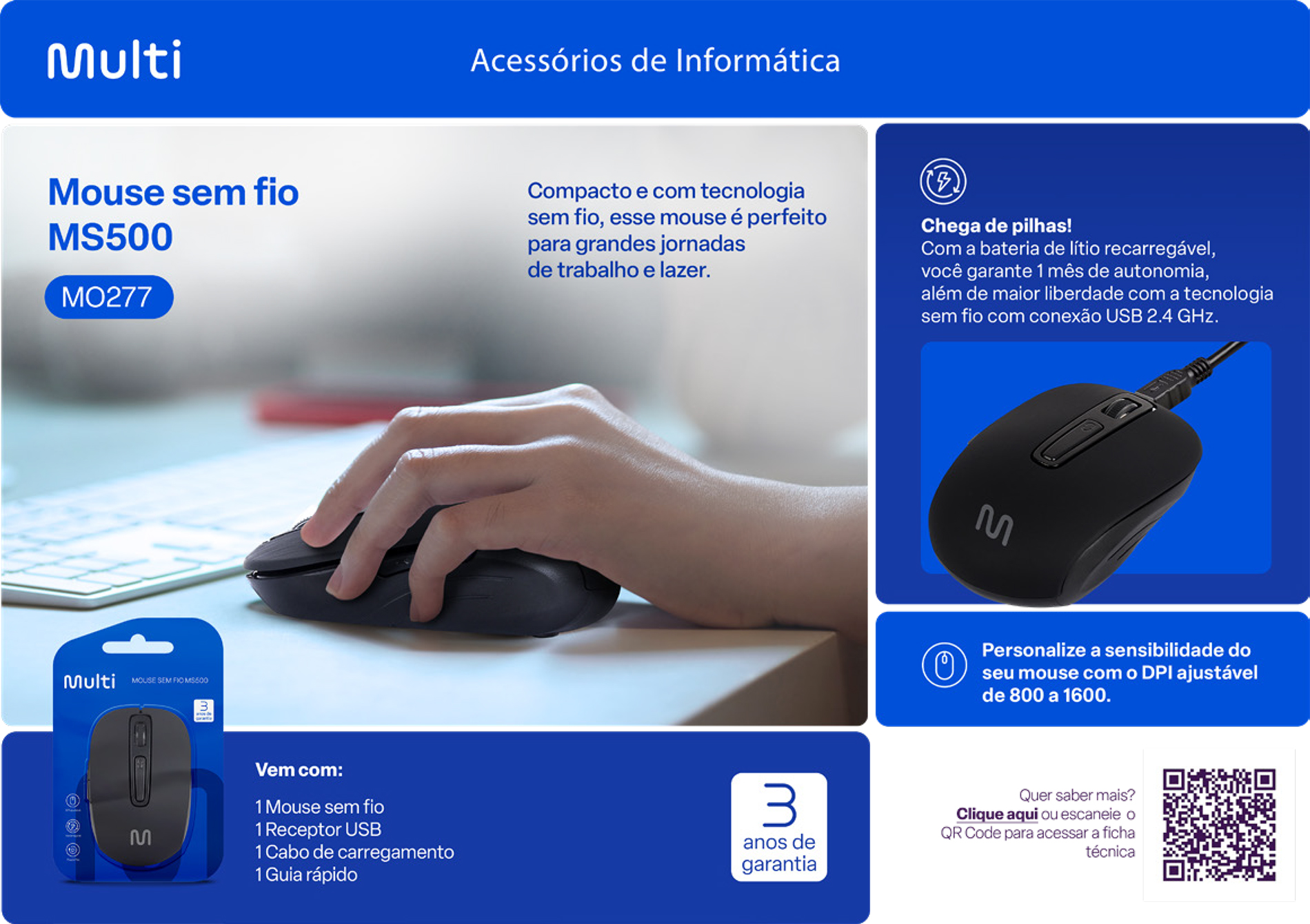 O Mouse Sem Fio vem com bateria recarregável. Produto de qualidade, ele conta com bateria de lítio, com tecnologia de conexão Plug e Play, uma velocidade que pode ser ajustada variando de 800, 1200 a 1600DPI e frequência sem fio de 2.4GHz, que te permite navegar com precisão e um rastreamento em alta definição. É possível carregar a bateria enquanto utiliza o mouse através da porta Micro USB. Compatível com carregadores de celular com a mesma conexão.! Detalhes: - Cor: Preto - Bateria: 250mAh - Bateria inclusa: NÃO - Conexão: Sem Fio - USB - Bateria de lítio recarregável - Velocidade DPI: 800, 1200, 1600 - Duração da bateria (meses): 1 mês - Clique e ou Teclas Silenciosas: SIM -Composição do Material: Polipropileno - Compatibilidade: Windows | Linux | MacOS | Windows® - Conteúdo da Embalagem: 1 Mouse; 1 Micro Receptor USB; 1 Cabo para Carregamento; 1 Guia do Usuário; - Garantia de 3 anos Código de Homologação da Anatel: 13015-21-03111