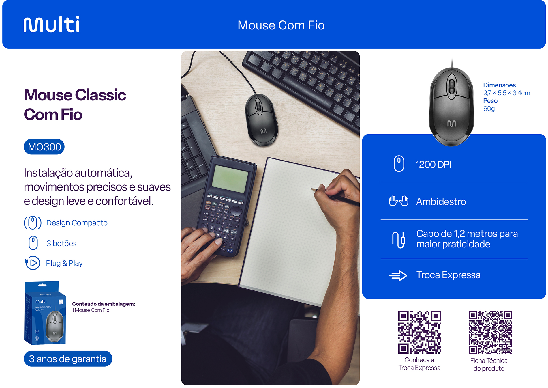 Este mouse é ideal para proporcionar praticidade e simplicidade ao seu dia-a-dia. Com tecnologia Plug e Play, conecte a entrada USB e comece a usar. Possui um design ergonômico, além de velocidade de 1200DPI que te permite navegar com precisão e um rastreamento em alta definição! Detalhes: - Cor: Preto - Plug & Play - Pilha inclusa: NÃO - Velocidade DPI: 1200 - Conexão: USB - Com Fio - Clique e ou Teclas Silenciosas: NÃO - Comprimento do Cabo (metros): 1,2m - Compatibilidade: Android | Windows | Linux | MacOS | Windows® - Composição do Material: Polipropileno - 3 anos de garantia