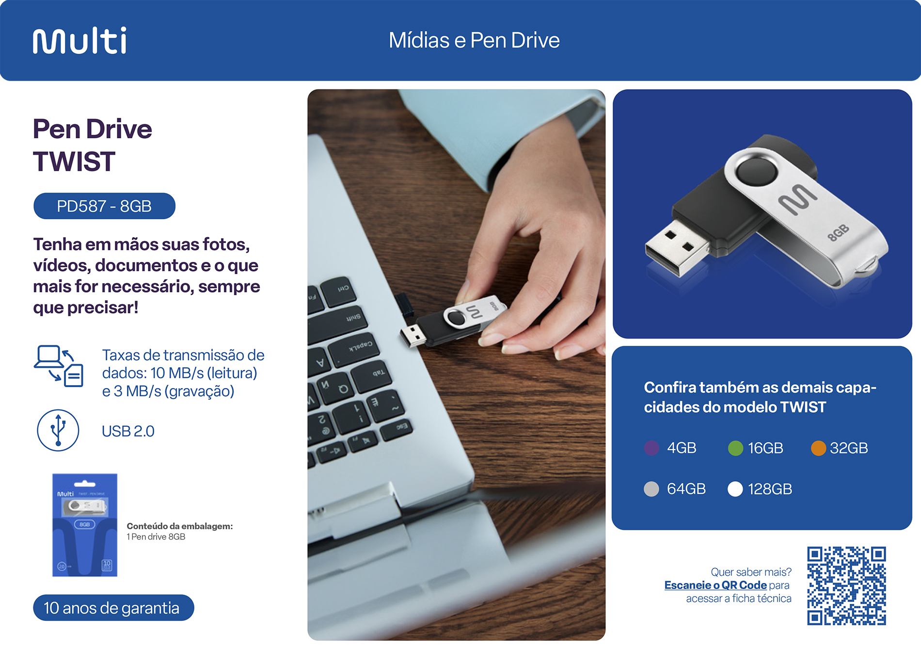 Armazene seus dados mais importantes de forma totalmente segura com os pen drives da Multilaser. Com um design compacto, você pode levar seus documentos, músicas e fotos para onde quiser. Detalhes: - Capacidade: 8 GB - Compatível: Mac OS 9.0 e superiores/ Windows 98 e superiores= - Taxas de transmissão de dados: 3 MB/s (gravação) e 10 MB/s (leitura) - Conexão USB 2.0: DC 5 V
