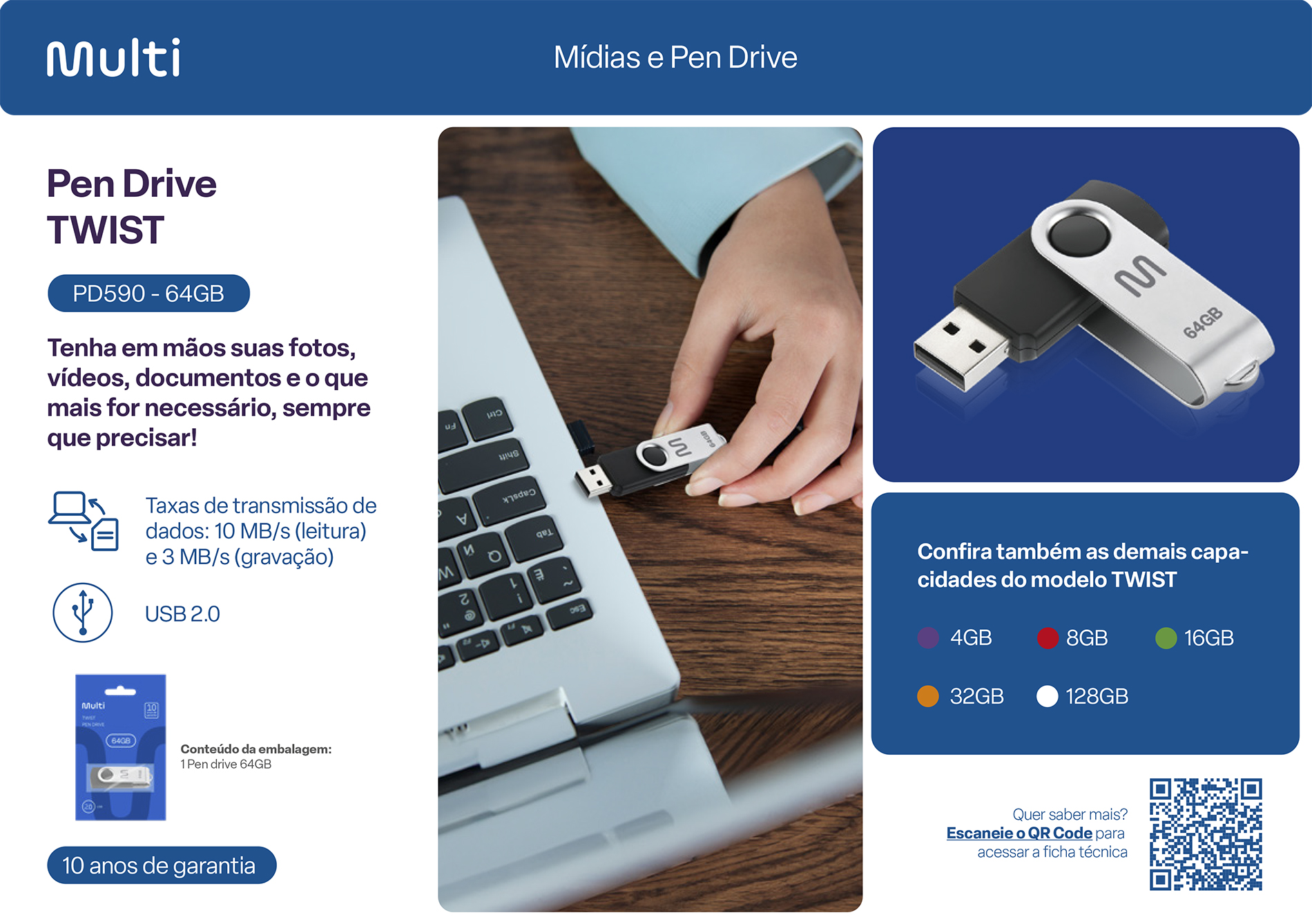 Armazene seus dados mais importantes de forma totalmente segura com os pen drives da Multilaser. Com um design compacto, você pode levar seus documentos, músicas e fotos para onde quiser. Detalhes: - Capacidade: 64 GB - Compatível: Mac OS 9.0 e superiores/ Windows 98 e superiores - Taxas de transmissão de dados: 3 MB/s (gravação) e 10 MB/s (leitura) - Conexão USB 2.0: DC 5 V