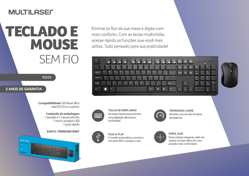 Este kit é ideal para proporcionar praticidade e simplicidade ao seu dia-a-dia, sem o uso de fios. Com tecnologia de conexão Plug e Play, conecte a entrada USB e comece a usar. O mouse com velocidade de 1200DPI e frequência sem fio de 2.4GHz, que te permitem navegar com precisão e um rastreamento em alta definição! O teclado conta com design ergonômico, teclas de perfil baixo e 12 teclas multimídia de atalho. Detalhes: - Perfil slim possui design elegante além de manter suas mãos em uma posição agradável - Teclas macias e silenciosas plug & play conexão automática, conecte a entrada usb e começe a usar - Praticidade e conforto elimine os fios da sua mesa e digite com mais conforto - Teclas de perfil baixo proporcionam uma digitação silenciosa e confortável - Tecnologia 2.4ghz permite o uso em até 8 metros de distância - Teclado alimentação 1 pilha palito AAA - Dimensões (mm) 435 x 135 x 23 - Mouse alimentação 1 pilha pequena AA. Código de Homologação da Anatel: 04710-16-03111